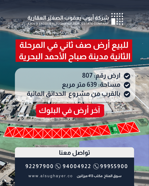 للبيع أرض رقم 807 صف ثاني في المرحلة الثانية مدينة صباح الأحمد البحرية