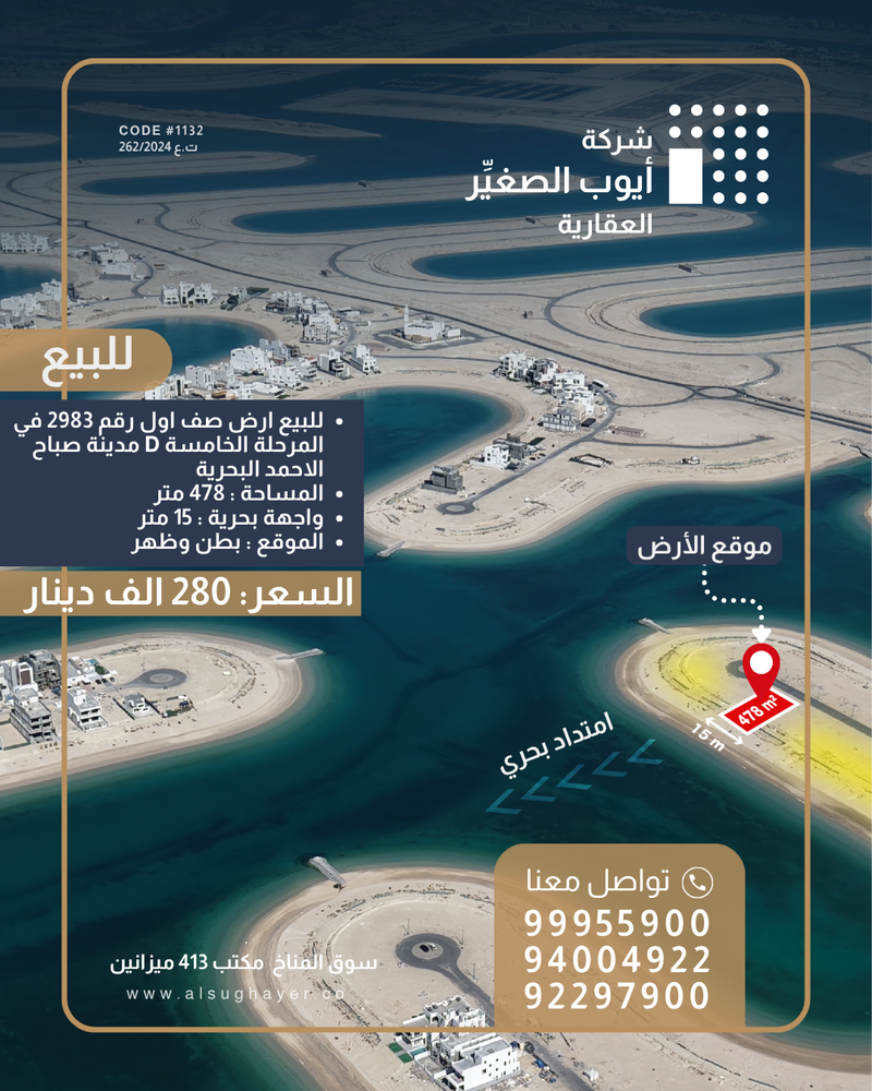 للبيع ارض صف اول رقم 2983 في المرحلة الخامسة مدينة صباح الاحمد البحرية