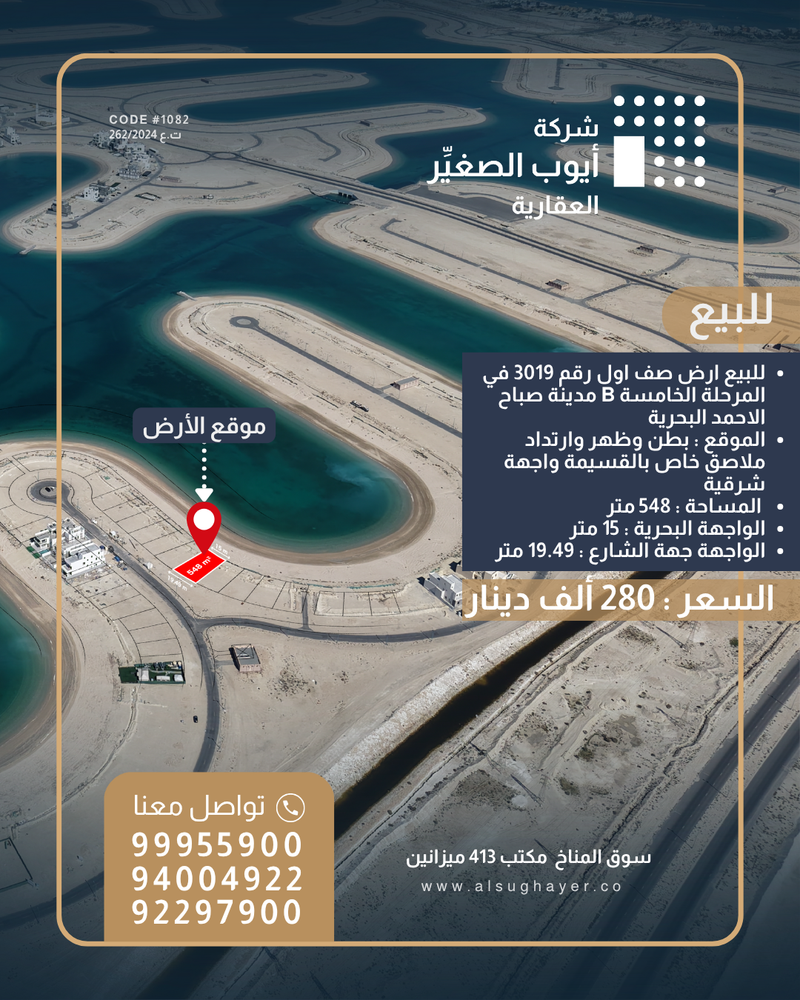 Click to expand Tap to zoom للبيع ارض صف اول رقم 3019 في المرحلة الخامسة مدينة صباح الاحمد البحرية تم البيع 280,000 KWD | / تفاصيل العرض تفاصيل العرض Code 1082 للبيع ارض صف اول رقم 3019 في المرحلة الخامسة مدينة صباح الاحمد البحرية المرحلة : الخامسة B الموقع : بطن وظهر وارتداد ملاصق خاص بالقسيمة واجهة شرقية المساحة : 548 متر الواجهة البحرية : 15 متر الواجهة جهة الشارع : 19.49 متر السعر : 280 الف للاستفسار نقال :99955900 نقال : 92297900 نقال: 94004922 نقال :97439175 شركة أيوب يعقوب الصغيِّر العقاريه سوق المناخ - مكتب 413 ميزانين www.alsughayer.co موقع الأرض كويت فايندر موقع الأرض Google Map واتس أب اتصل بنا ما تم إضافته إلى قائمة العروض المفضلة ** total_quantity ** | ** unit_price ** / ** unit_measure ** (-) Cart subtotal