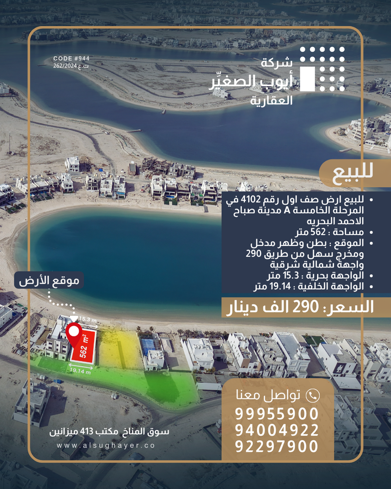 للبيع ارض صف اول رقم 4102 في المرحلة الخامسة مدينة صباح الاحمد البحريه