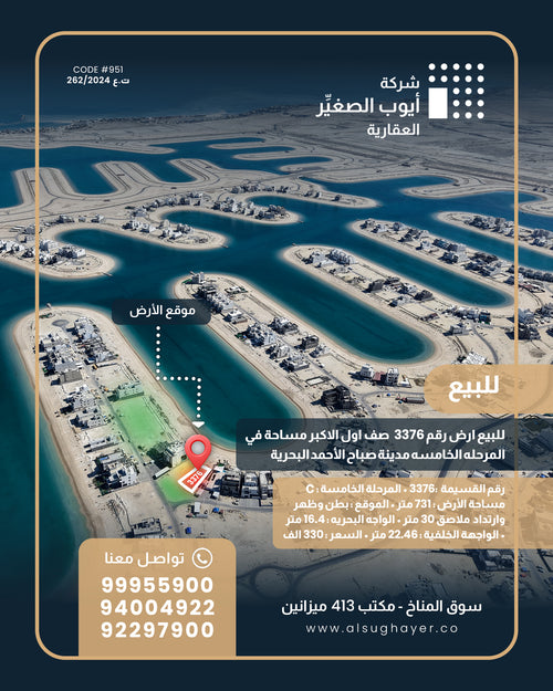 Code 951 للبيع ارض رقم 3376 صف اول الاكبر مساحة في المرحله الخامسه مدينة صباح الأحمد البحرية رقم القسيمة :3376 المرحلة الخامسة : C مساحة الأر...