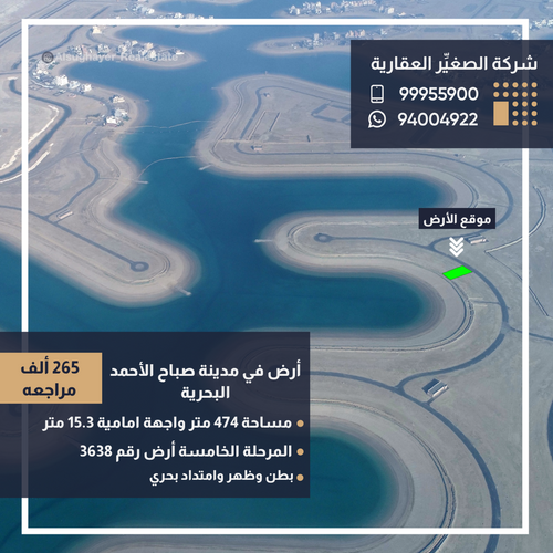 للبيع أرض في مدينة صباح الأحمد البحرية المرحلة : الخامسة الموقع : بطن وظهر رقم الارض : 3638 المساحة : 474 متر الواجهة البحرية : 15.39 متر الواج...