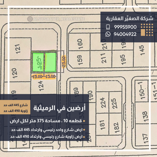للبيع أرضين في الرميثية قطعه : 10 مساحة كل ارض : 375 متر الموقع والسعر : شارع واحد رئيسي وارتداد : حد 445 الف دينار زاوية شارع رئيسي وارتداد :...